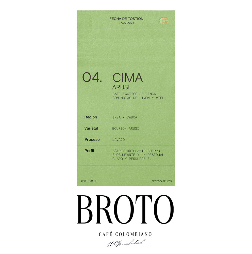Es un café especial de origen colombiano, cultivado en las montañas de Huila y Cauca a altitudes de 1,700 a 2,200 msnm. Su proceso lavado tradicional realza un perfil de taza único, con notas de panela, limón y miel, complementadas por una acidez brillante y un cuerpo burbujeante. Este café ofrece una experiencia sensorial equilibrada y estructurada, ideal para paladares exigentes. Su residual claro y persistente deja una impresión inolvidable en cada sorbo. Cultivado bajo prácticas sostenibles y un manejo agronómico experto, Cima Arusi es una expresión auténtica de la riqueza cafetera de Colombia.